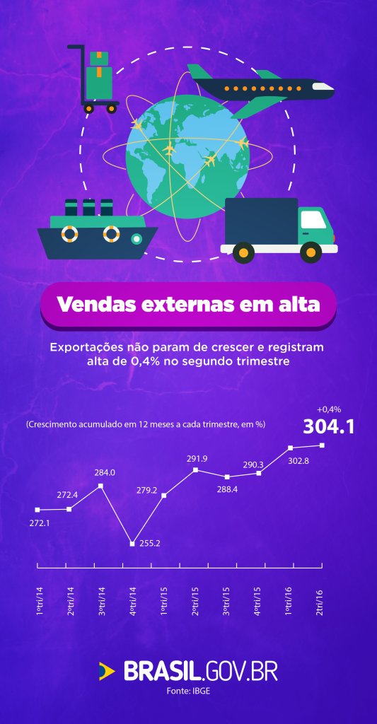 10 set Portal Brasil Postado por confep Exportações favorecem PIB e avançam 0,4% no trimestre Destaques das exportações foram veículos automotores, agropecuária, metalurgia e papel e celulose ... Continuar lendo