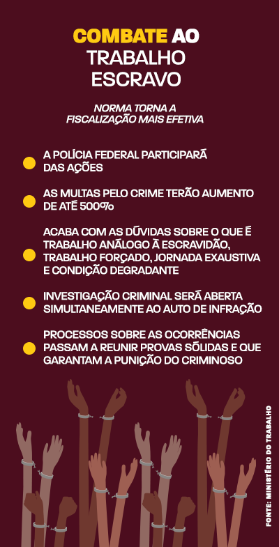 29 out Portal Brasil Postado por confep Governo cria regras para criminalizar quem mantém trabalho escravo Fiscalização mais severa, multas elevadas e a participação da Polícia Federal estão entre as medidas que vão g... Continuar lendo