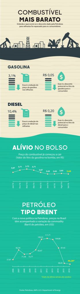 13 nov Portal Brasil Postado por confep Petrobras anuncia queda no preço da gasolina e do diesel Gasolina ficou 3,1% mais barato para as distribuidoras e poderá custar menos R$ 0,05 por litro nas bombas de c... Continuar lendo