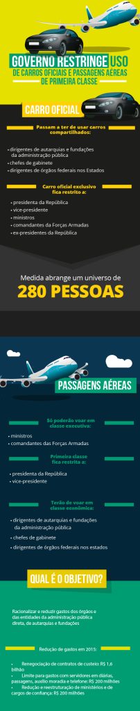 24 out Portal Brasil Postado por confep Governo limita uso de carros oficiais e de viagens em primeira classe Restrição tem como objetivo reduzir gastos públicos e faz parte dos ajustes anunciados pela presidenta Dilma R... Continuar lendo
