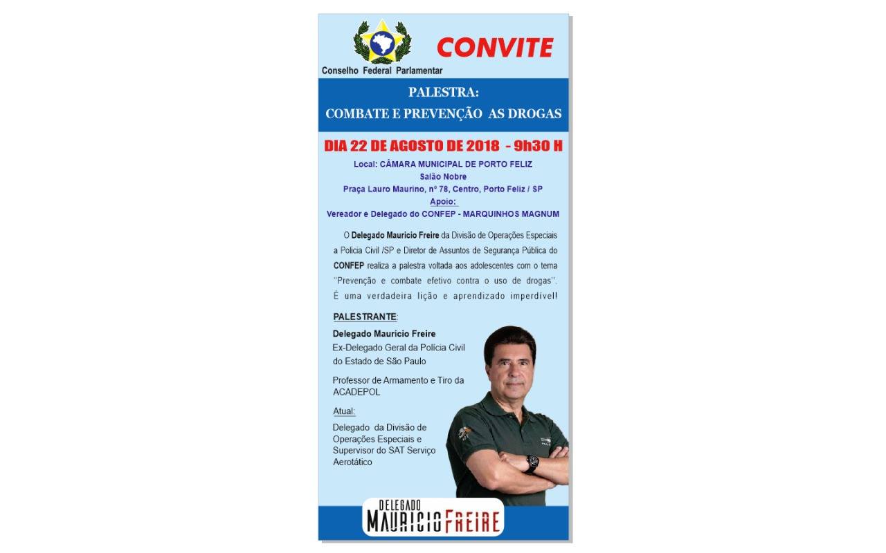 O Delegado Mauricio Freire, atual diretor de assuntos de segurança pública do CONFEP, acompanhado pelo Delegado Edson Nakamura, também diretor da pasta e pelos membros Sergio Bertero – Delegado Regional CONFEP/SP, João Nunes – Delegado Corregedor – CONFEP, Cleber Bertero – Delegado ADJ/SP, Márcia Freire – Diretora Assuntos Internacionais CONFEP, e no município representado pelo Delegado Municipal e Vereador Marquinhos Magnum, foi realizado uma palestra anti drogas a alunos do ensino médio (idade 14 +).