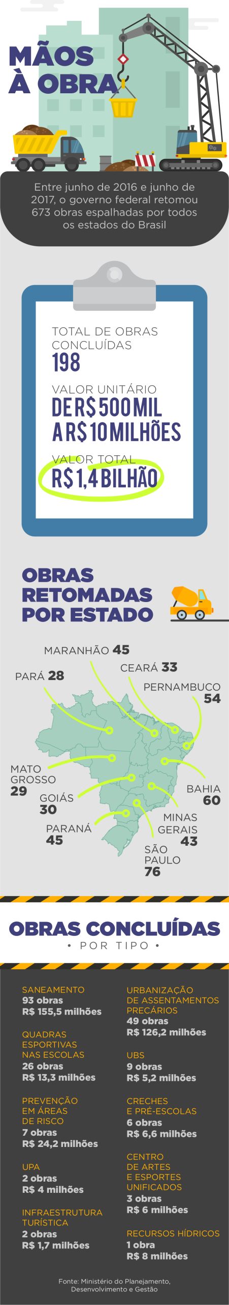 O governo federal apresentou nesta quinta-feira (24) o balanço da retomada de 673 obras que estavam paralisadas no País. Com investimento de R$ 1,4 bilhão, 475 obras recomeçaram e 198 foram concluídas no período de um ano.