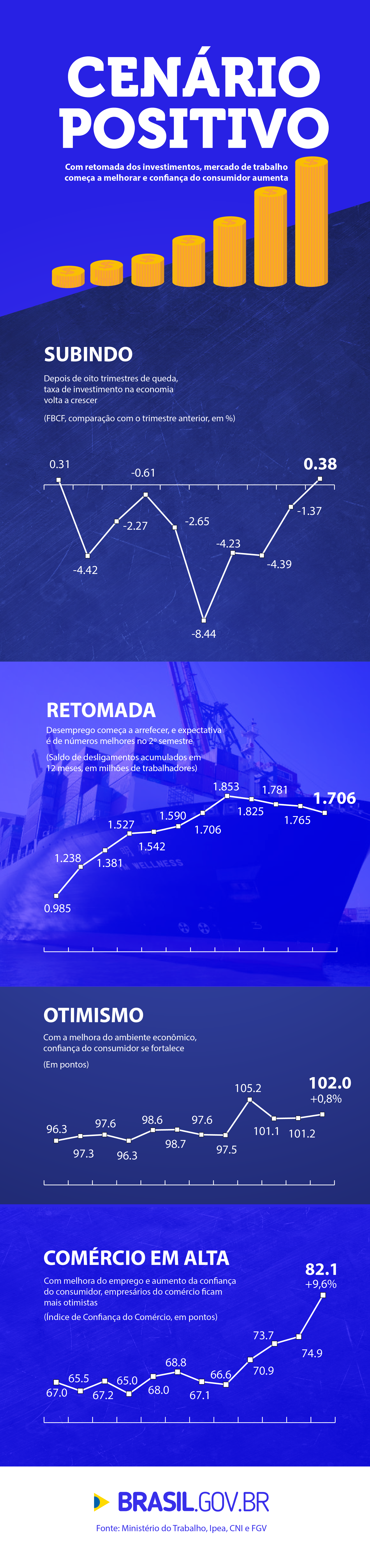 Esse ciclo de acontecimentos positivos tem influenciado ainda a taxa de investimentos da economia, que depois de oito trimestres em queda voltou a crescer.