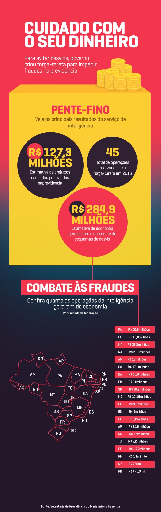 Com uma fiscalização mais intensa e o uso de forças-tarefa, o governo conseguiu desmontar esquemas de desvio na Previdência que permitiram economizar R$ 284,9 milhões. Apenas em 2016, 45 operações foram realizadas para garantir o bom uso do dinheiro público.