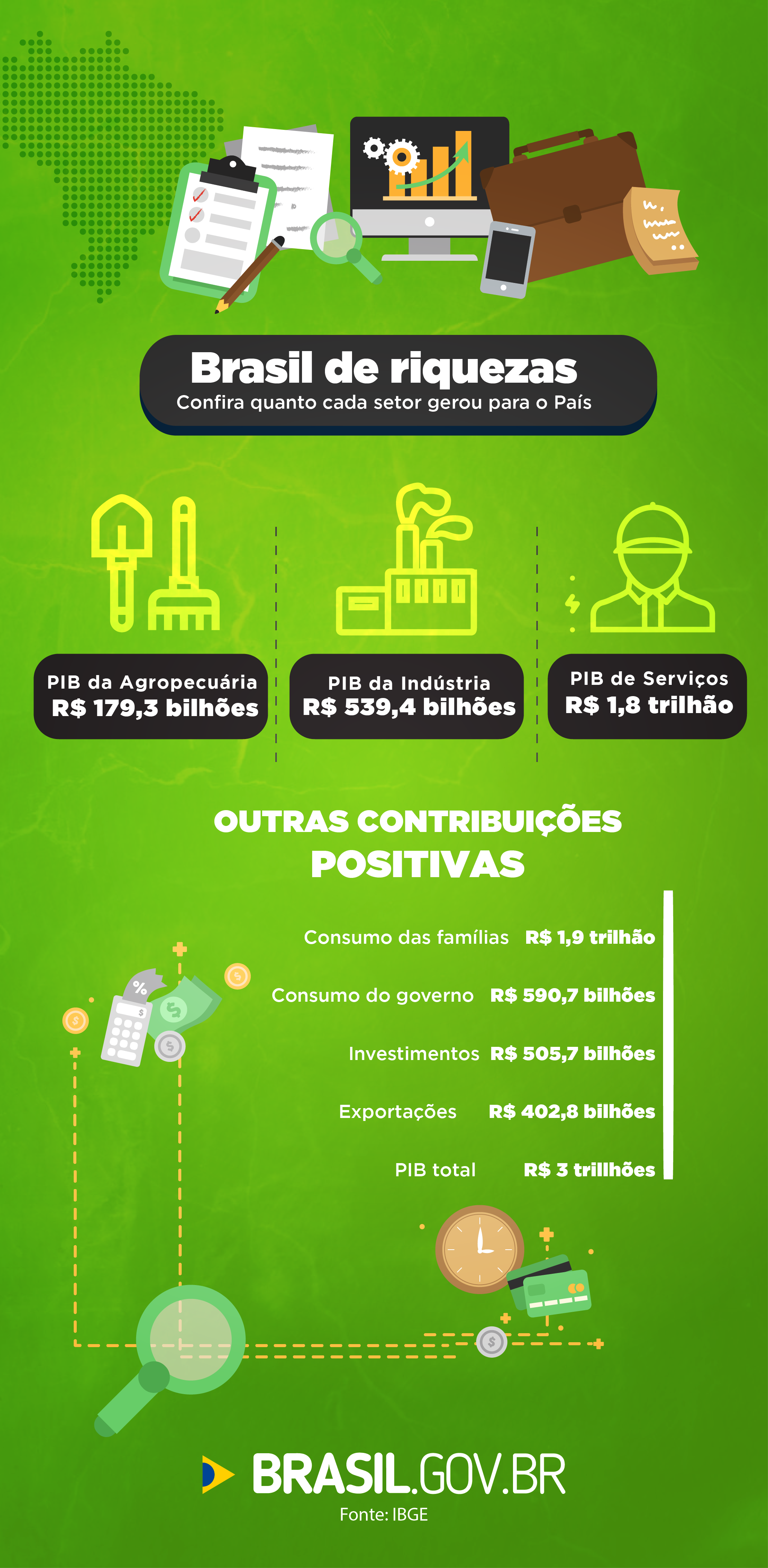 No grupo classificado como despesa, mas que também ajudam a compor o PIB, o consumo das famílias deu contribuição negativa ao registrar retração de 0,7%. No mesmo grupo, é medido o gasto do setor público, que, no período, retraiu-se 0,5%.