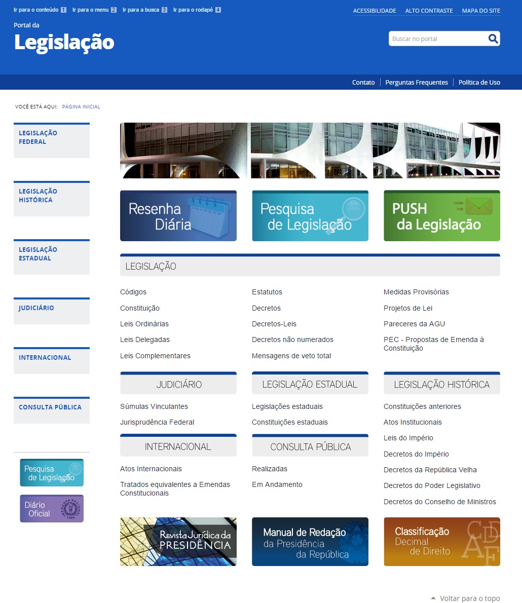 O conteúdo do portal não mudou. O novo desenho do site dá mais destaque para a resenha diária – que resume legislações publicadas em cada dia – para a pesquisa de leis e ao Push da Legislação, ferramenta de notificações sobre publicação de leis, decretos e medidas provisórias.