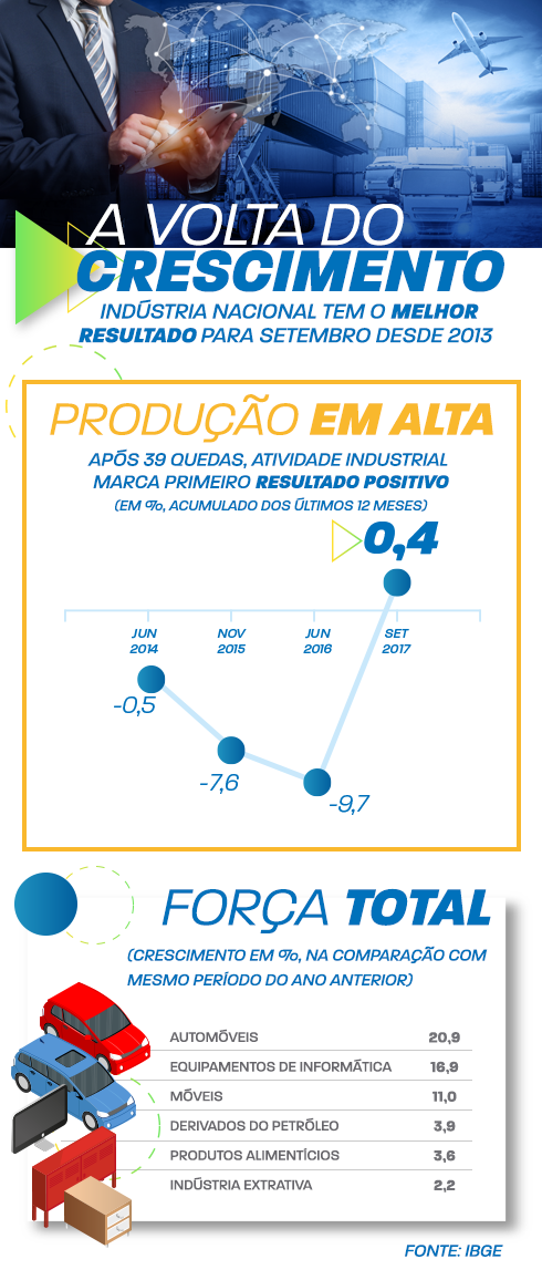 Com esse resultado, a produção industrial brasileira atingiu 0,4% no acumulado em 12 meses, depois de 39 meses de resultados negativos nessa mesma base de comparação.